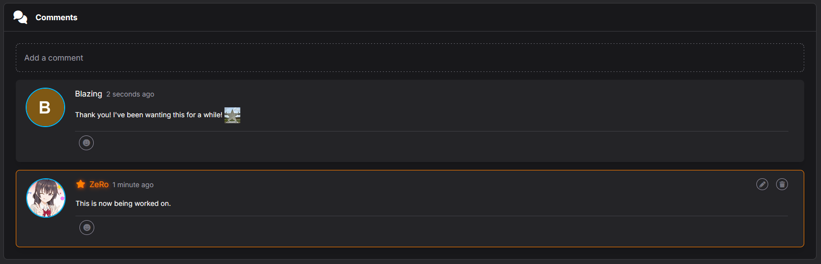 Reactions are available on comments, in addition reactions are available on Issues, news posts and much more.