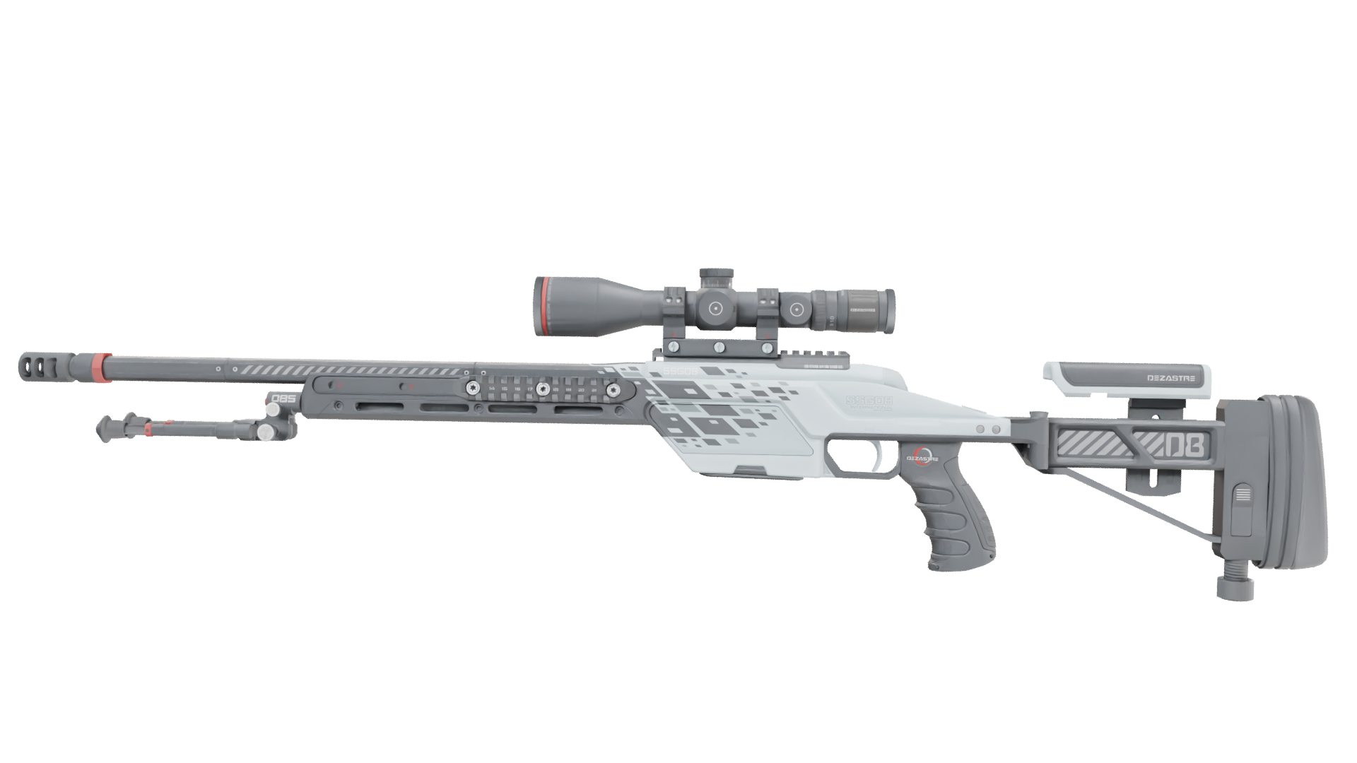 The SSG08 bolt-action is a low-damage but very cost-effective sniper rifle, making it a smart choice for early-round long-range marksmanship. It has been custom painted with a high tech black, white, and red design.