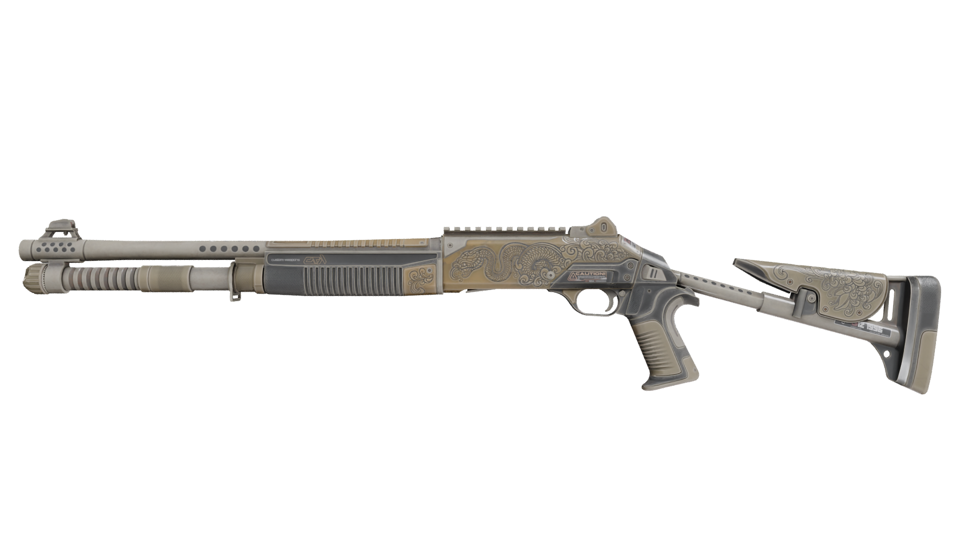 The XM1014 is a powerful fully automatic shotgun that justifies its heftier price tag with the ability to paint a room with lead fast. A snake has been custom painted atop a gold-colored base in a style inspired by the Japanese tattoo art style Irezumi.