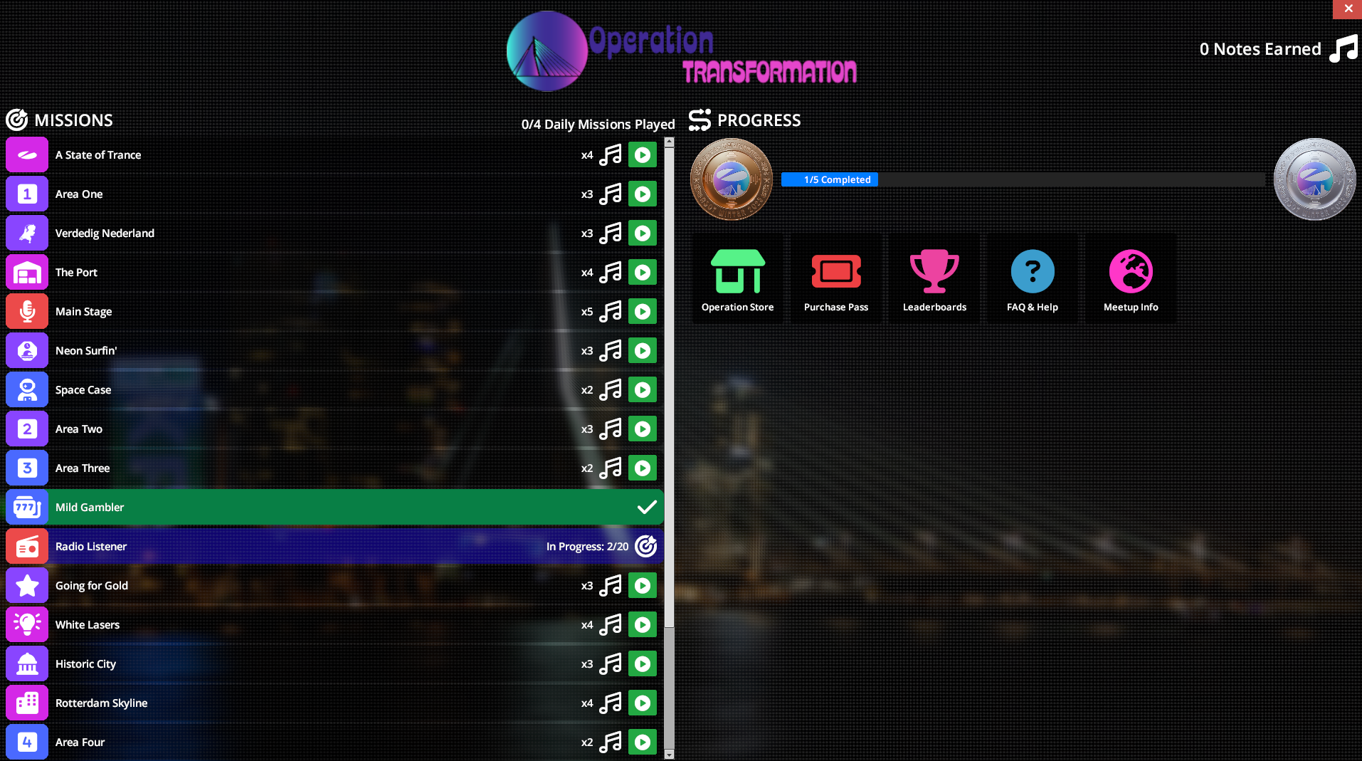 With 20 missions to complete, Operation TRANSFORMATION features missions styles around Rotterdam and EDM music.