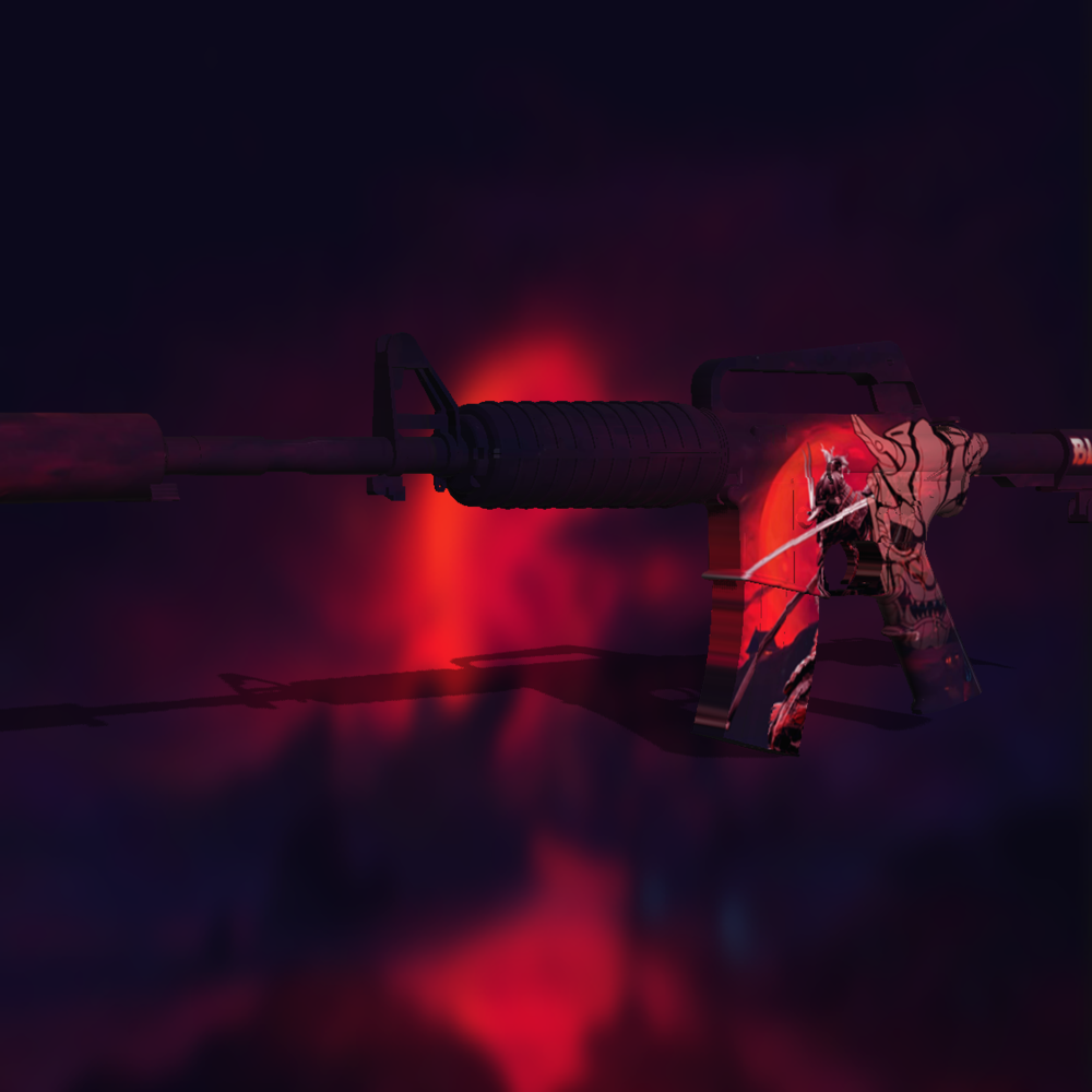 This M4A1-S skin is drenched in the ominous hues of a rising blood moon, symbolizing both destruction and elegance. The body of the rifle is painted with deep reds, purples, and black tones, mimicking the eerie glow of a lunar eclipse. On the magazine and side of the weapon, a fierce, armored samurai stands poised for battle, illuminated by the crimson glow of the moon, wielding a katana with precision and grace. The suppressor is wrapped in dark clouds, enhancing the mysterious and foreboding atmosphere.